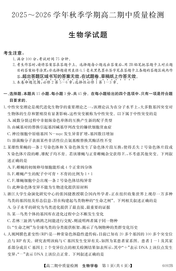 高二生物--安徽省华师联盟2025~2026学年秋季学期高二期中质量检测