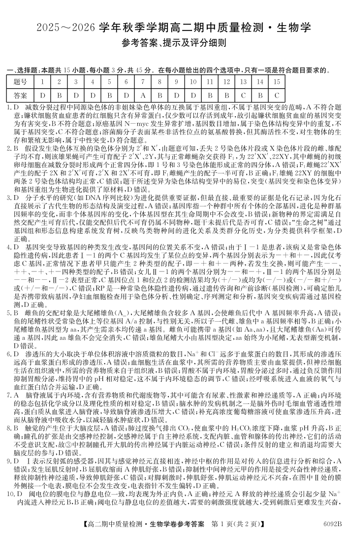 高二生物答案--安徽省华师联盟2025~2026学年秋季学期高二期中质量检测
