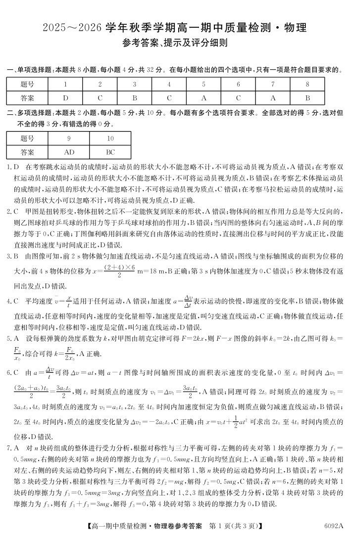 高一物理答案--安徽省华师联盟2025~2026学年秋季学期高一期中质量检测