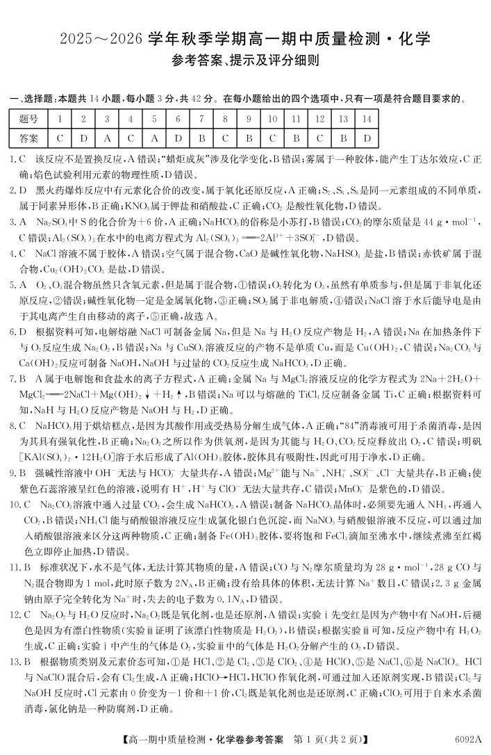 高一化学答案--安徽省华师联盟2025~2026学年秋季学期高一期中质量检测