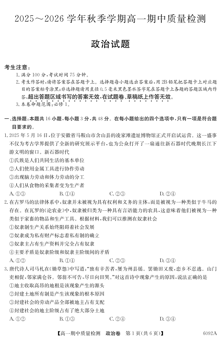 高一政治--安徽省华师联盟2025~2026学年秋季学期高一期中质量检测