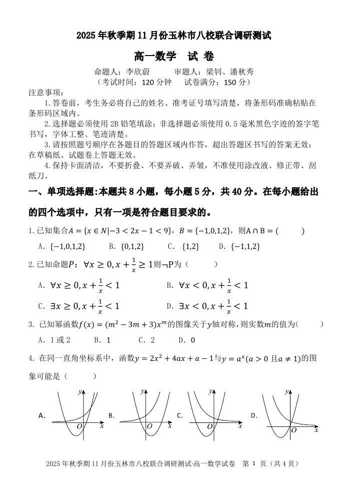 高一数学--广西玉林市八校2025-2026学年高一年11月联合调研测试