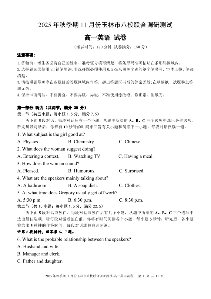 高一英语--广西玉林市八校2025-2026学年高一年11月联合调研测试
