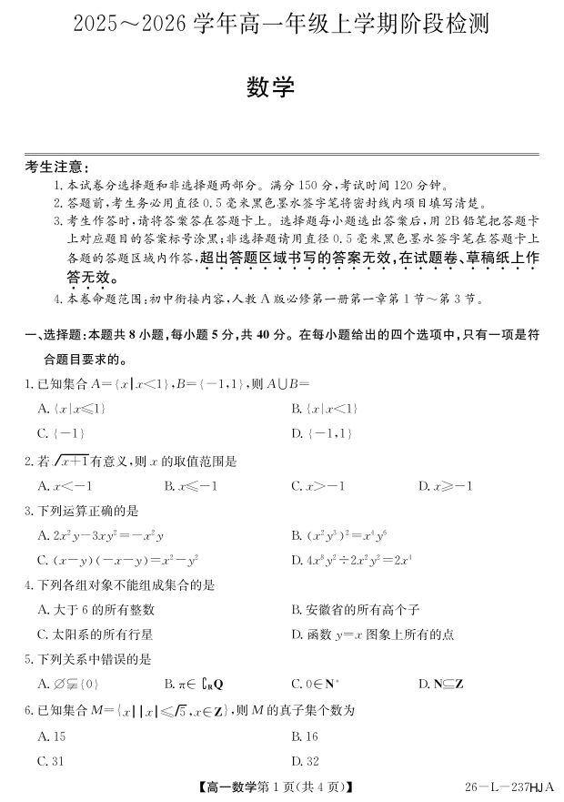 高一数学(夯基卷)--安徽省江淮名校2025-2026学年高一上学期阶段联考