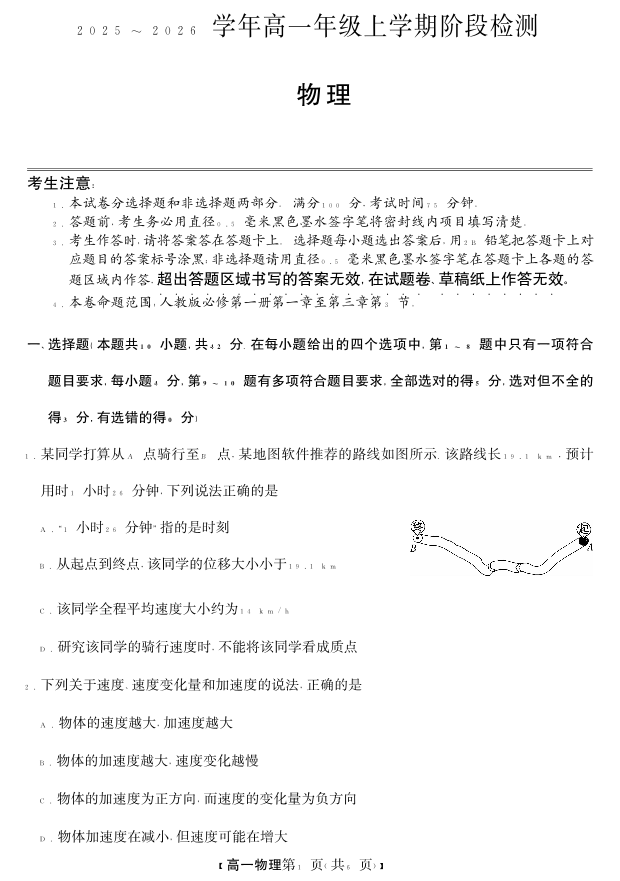 高一物理(冲本卷)--安徽省江淮名校2025-2026学年高一上学期阶段联考