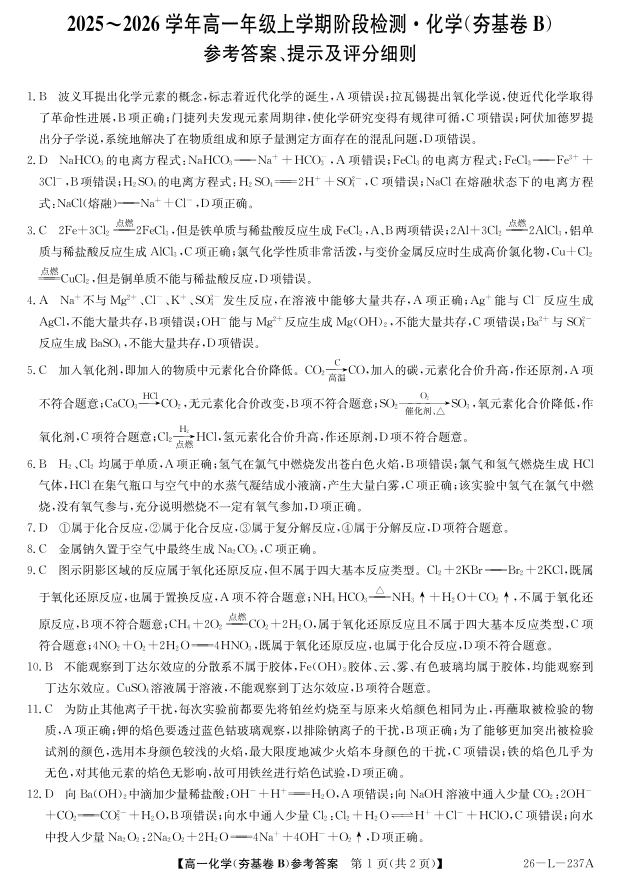 高一化学答案(夯基B)--安徽省江淮名校2025-2026学年高一上学期阶段联考