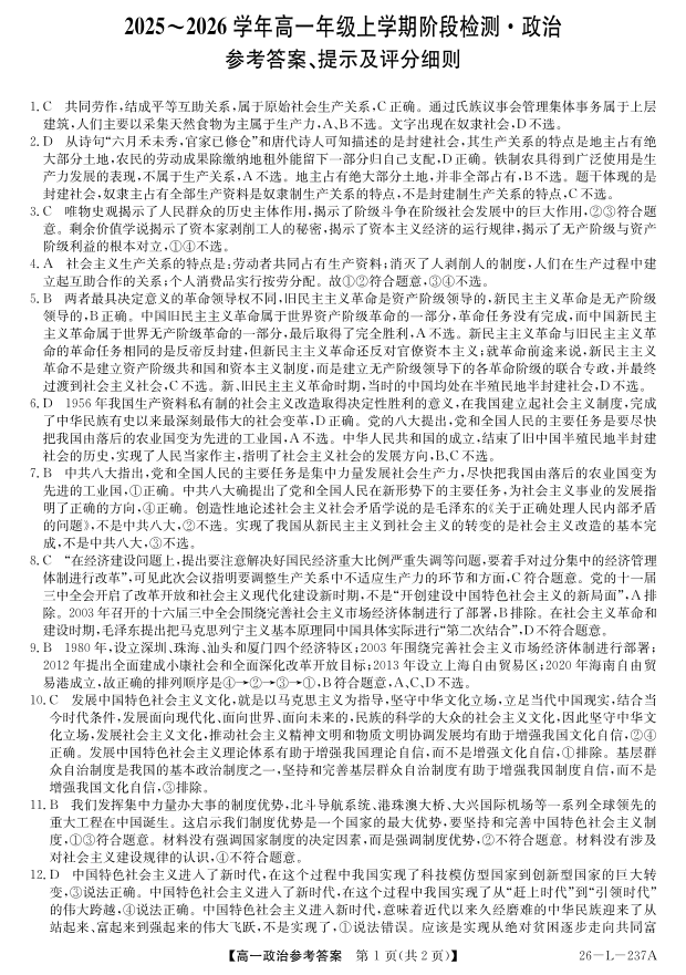 高一政治答案--安徽省江淮名校2025-2026学年高一上学期阶段联考