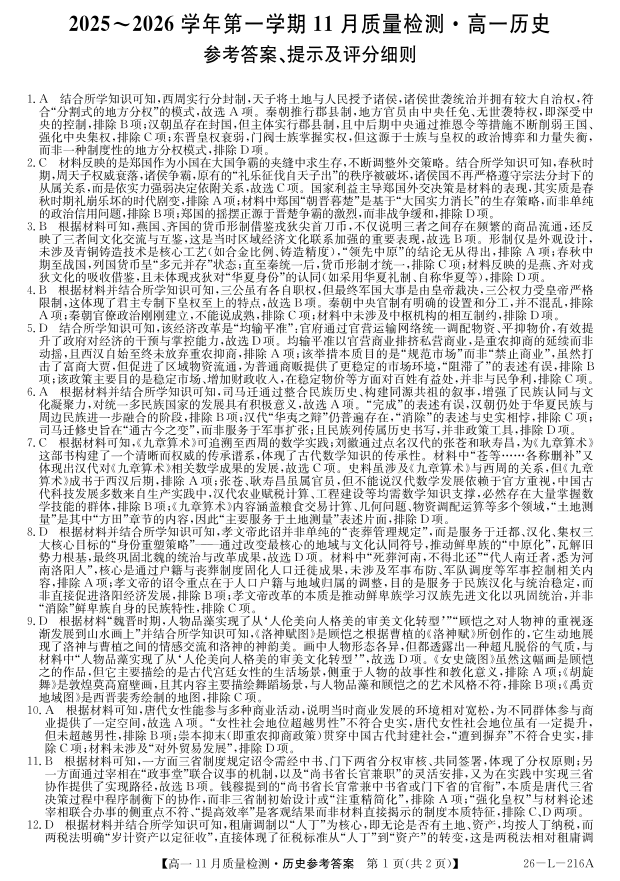 高一历史答案--安徽省县中联盟2025-2026学年第一学期高一期中考试