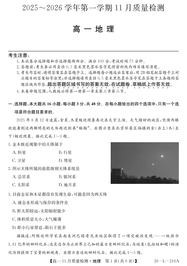 高一地理--安徽省县中联盟2025-2026学年第一学期高一期中考试