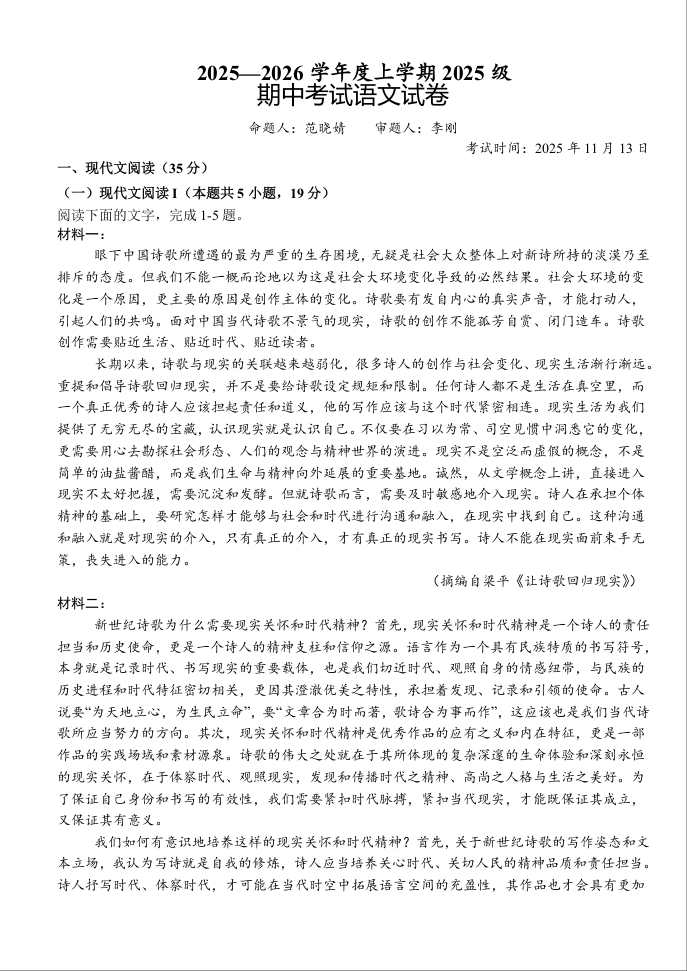 高一语文--湖北省荆州市沙市中学2025-2026学年高一上学期11月期中考试