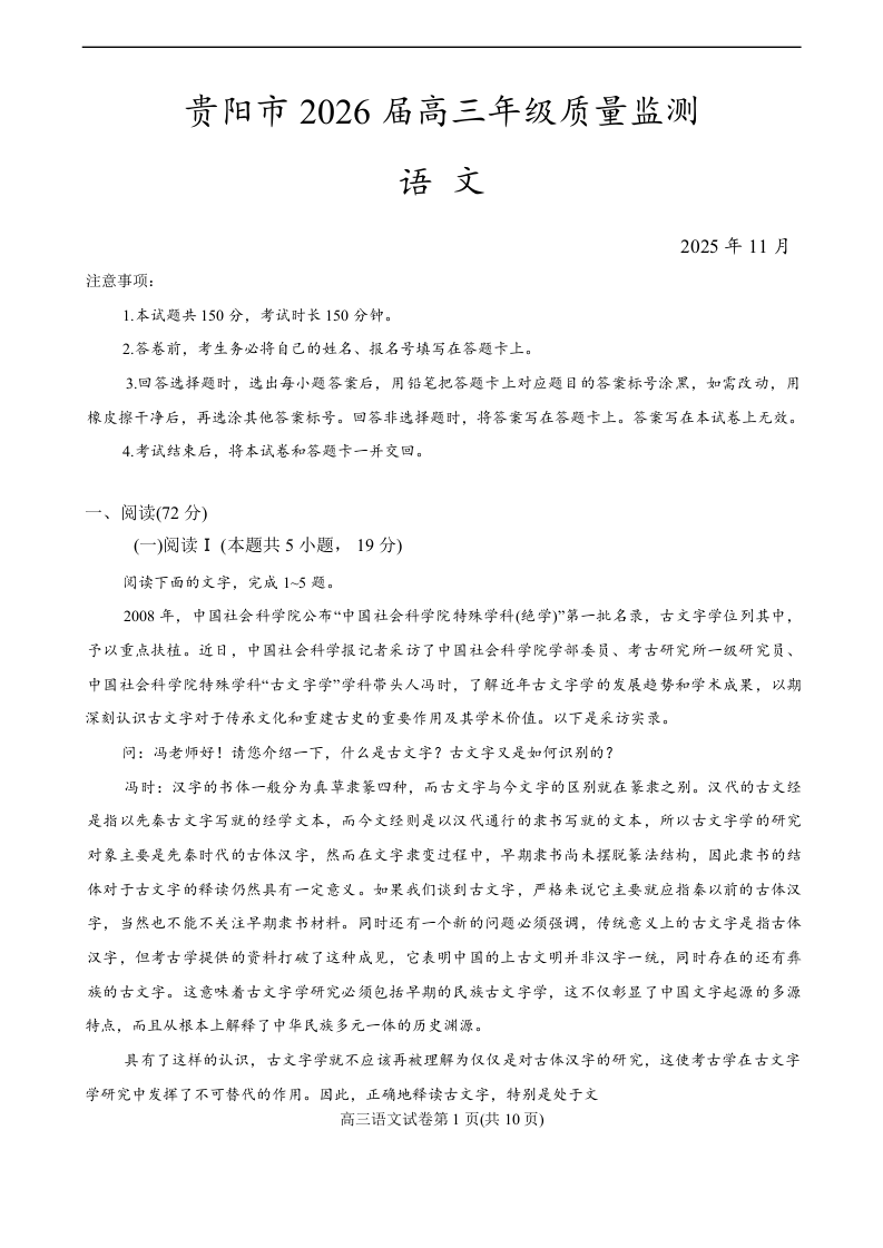 高三语文--贵州省贵阳市2026届高三上学期11月质量监测
