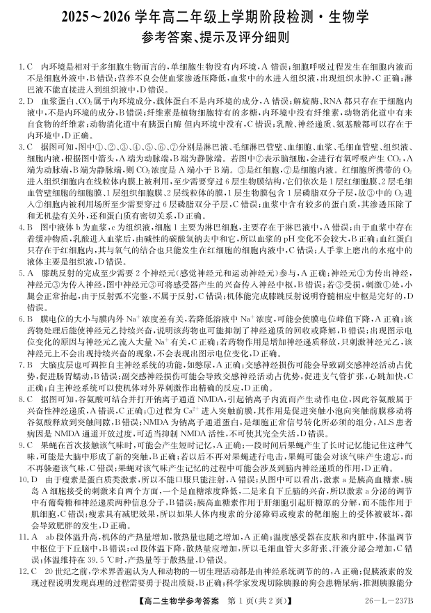 高二生物答案--安徽省江淮名校2025-2026学年高二上学期阶段联考