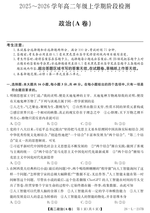 高二政治A卷--安徽省江淮名校2025-2026学年高二上学期阶段联考