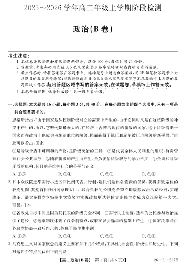 高二政治B卷--安徽省江淮名校2025-2026学年高二上学期阶段联考