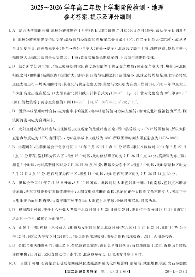 高二地理答案--安徽省江淮名校2025-2026学年高二上学期阶段联考