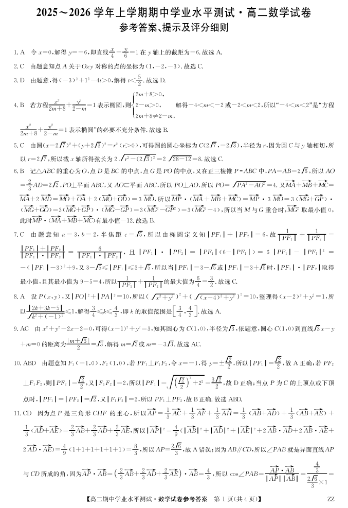 高二数学答案--河南省郑州市八校联盟2025-2026学年高二上学期11月期中考试