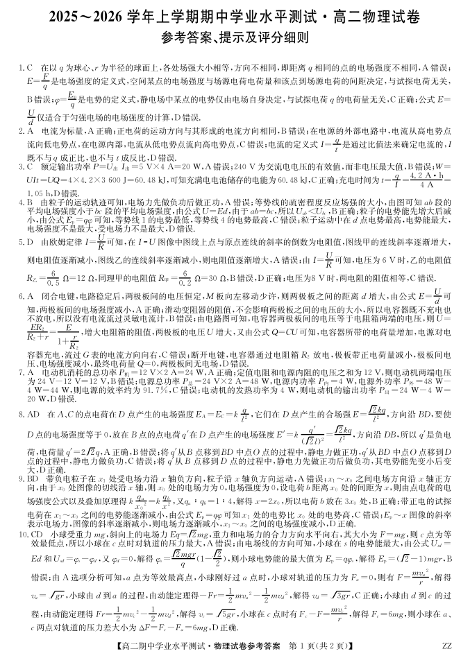 高二物理答案--河南省郑州市八校联盟2025-2026学年高二上学期11月期中考试