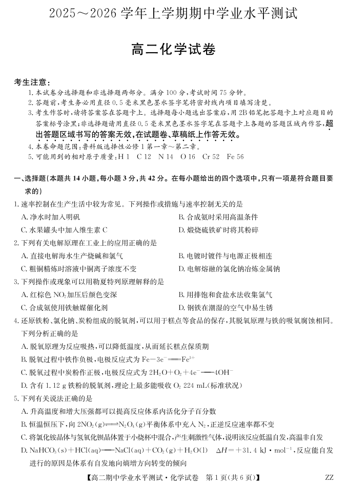 高二化学--河南省郑州市八校联盟2025-2026学年高二上学期11月期中考试
