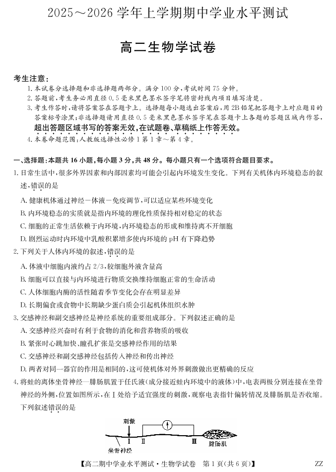 高二生物--河南省郑州市八校联盟2025-2026学年高二上学期11月期中考试