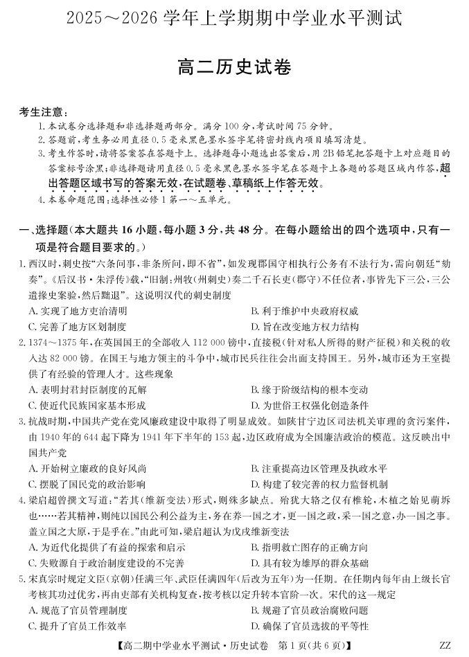 高二历史--河南省郑州市八校联盟2025-2026学年高二上学期11月期中考试