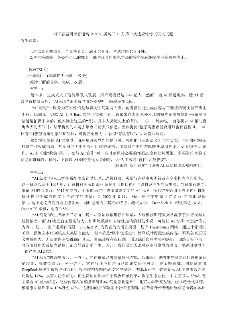 高三语文+答案--浙江省省温州市普通高中2026届高三第一次适应性考试(温州一模)