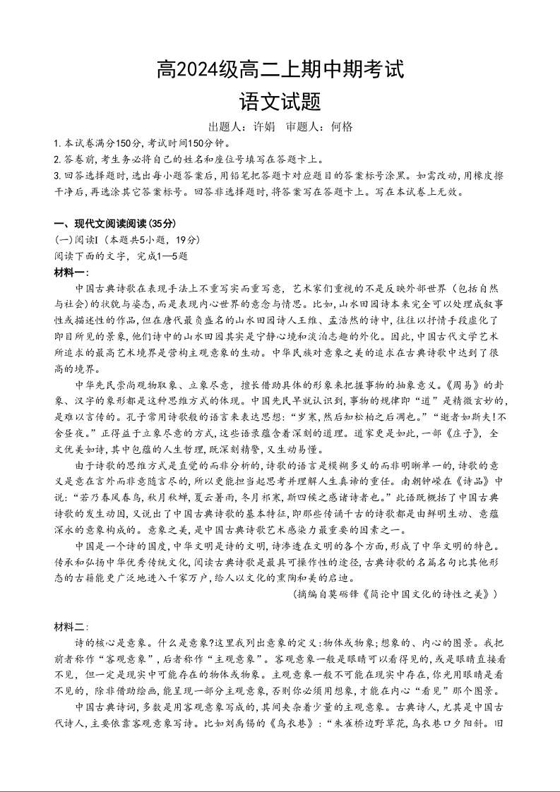 高二语文--重庆市万州二中2025-2026学年高二上学期期中考试