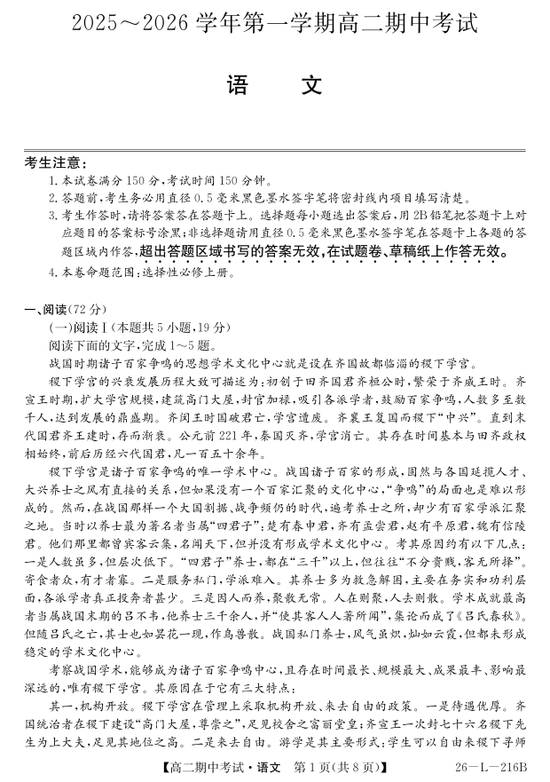高二语文--安徽省县中联盟2025-2026学年第一学期高二期中考试(26-L-216B)