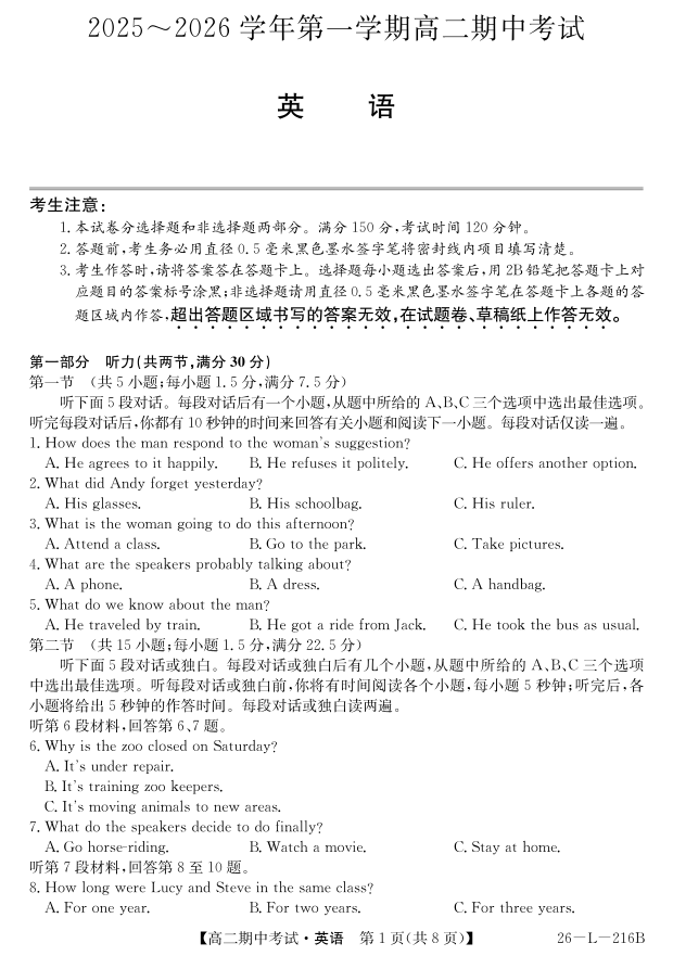 高二英语--安徽省县中联盟2025-2026学年第一学期高二期中考试(26-L-216B)