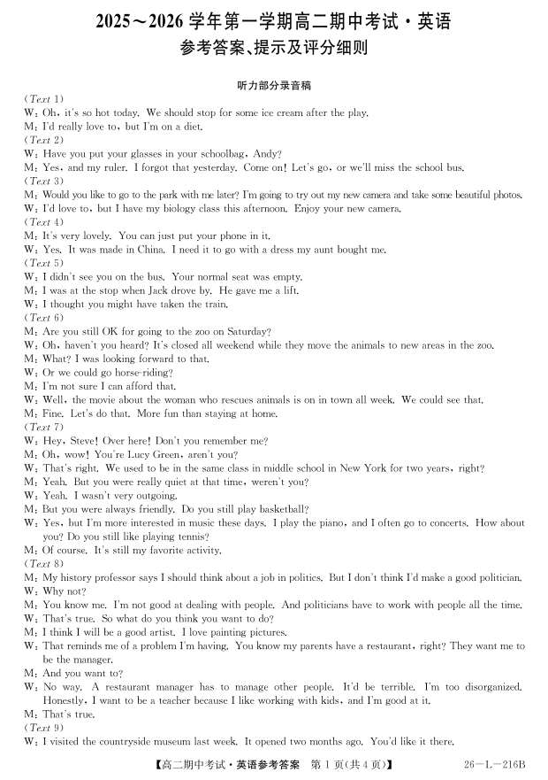 高二英语答案--安徽省县中联盟2025-2026学年第一学期高二期中考试(26-L-216B)