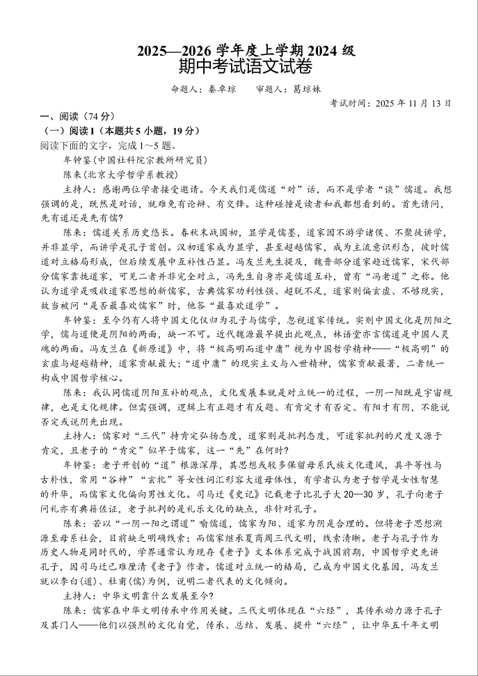 高二语文--湖北省荆州市沙市中学2025-2026学年高二上学期期中考试