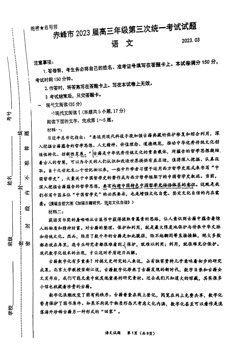 高三语文--内蒙古赤峰市高三第三次统一考试3.15-16