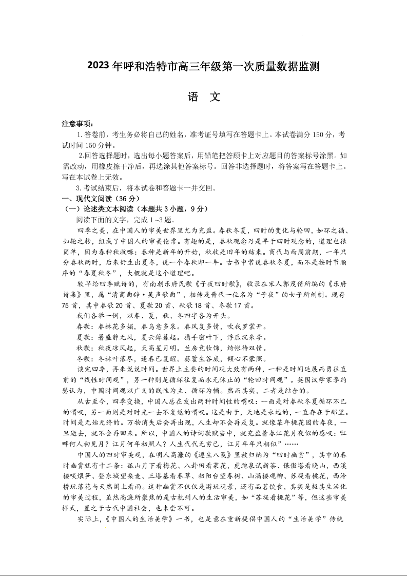 高三语文--内蒙古呼和浩特市2023届高三第一次质量数据监测