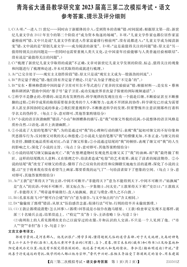 高三语文答案--青海省西宁市2023届高三二模