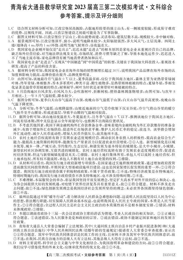 高三文综答案--青海省西宁市2023届高三二模