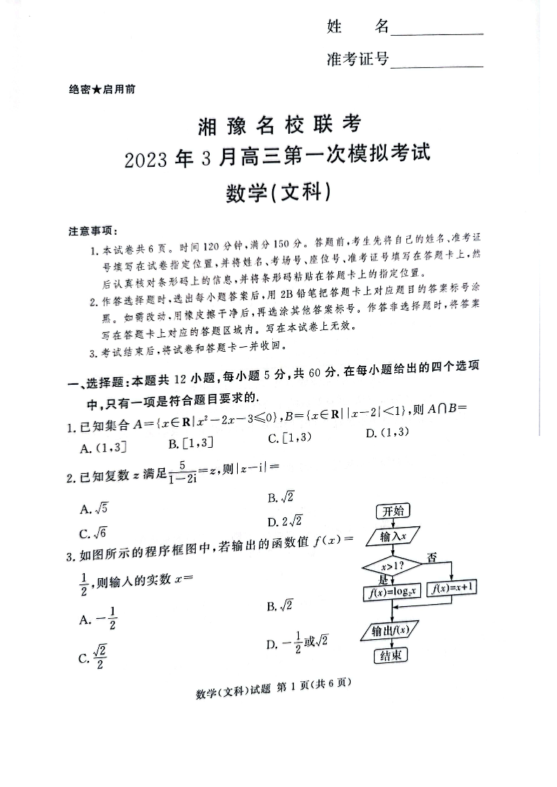 高三文数--湘豫名校联考高三3月第一次模拟考试3.1-2