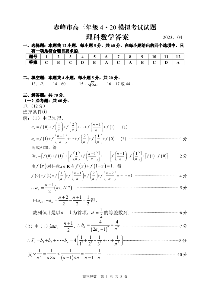 高三理科数学(教师版)--内蒙古赤峰市2023届高三年级420模拟考试