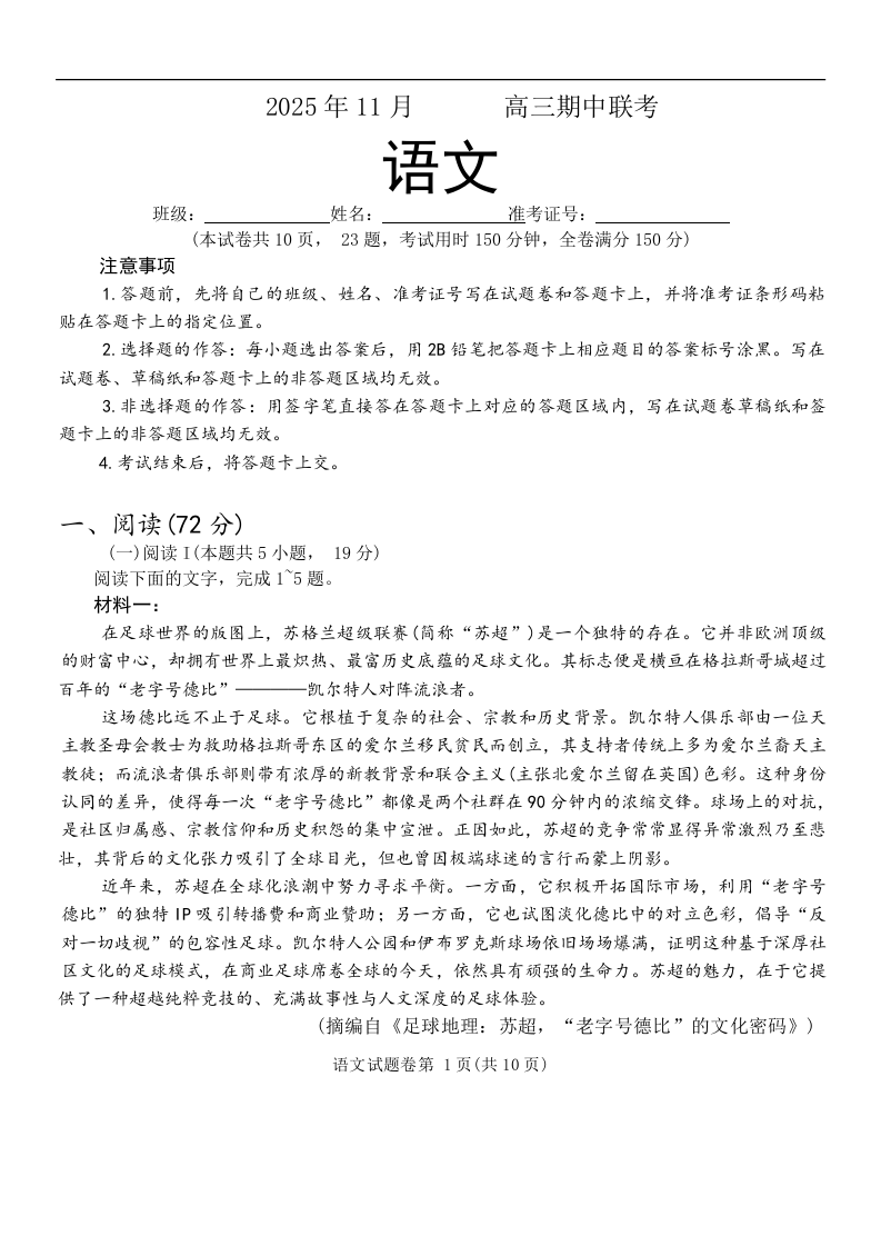 高三语文--湖南省A佳联考2026届高三上学期11月期中考试