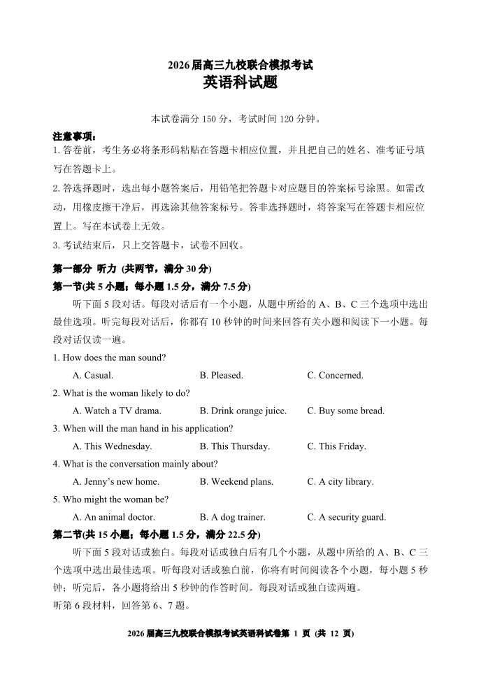 高三英语+答案--吉林省2026届高三九校11月联合模拟考