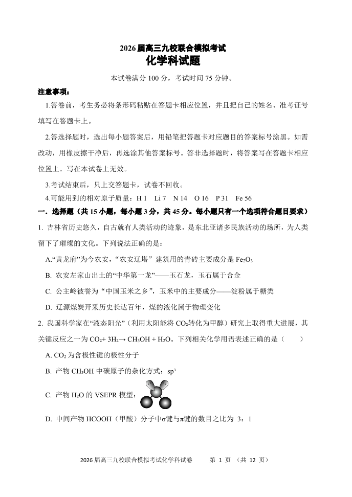 高三化学+答案--吉林省2026届高三九校11月联合模拟考