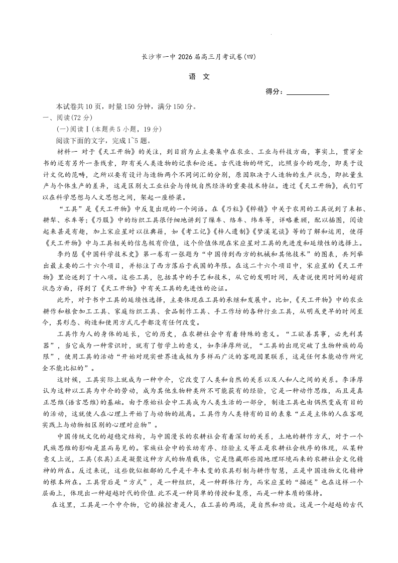 高三语文+答案--湖南省长沙市第一中学2026届高三上学期月考(四)(11月)