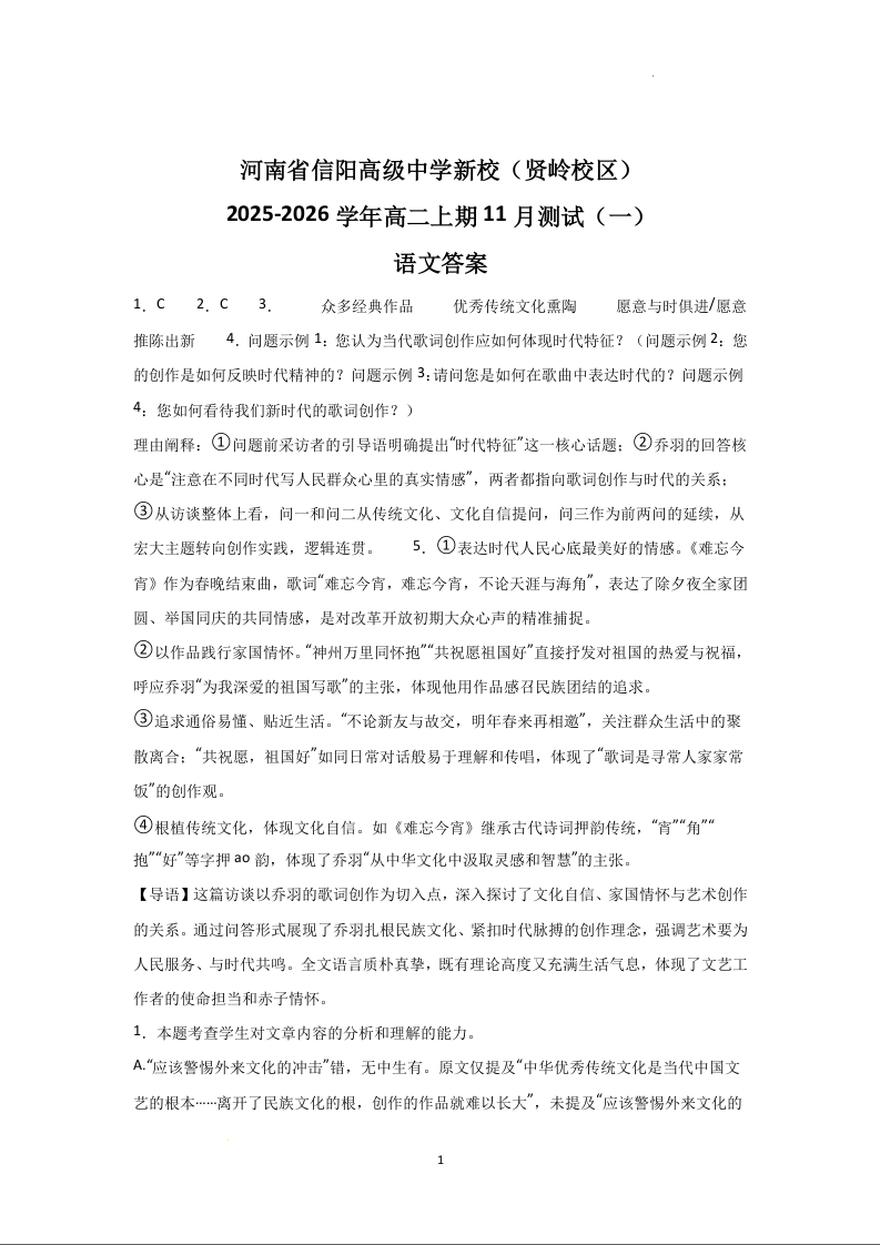 高二语文答案--河南省信阳高级中学2025-2026学年高二上学期11月月考