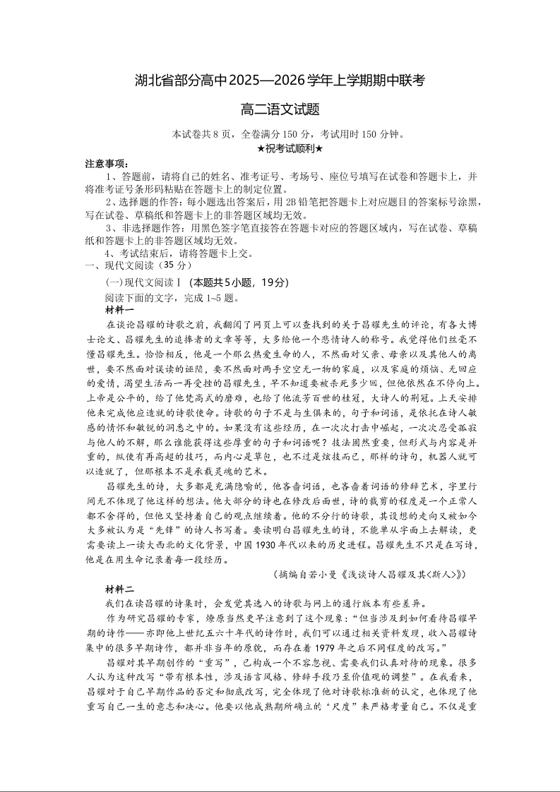 高二语文--湖北省部分高中联考2025-2026学年高二上学期11月期中