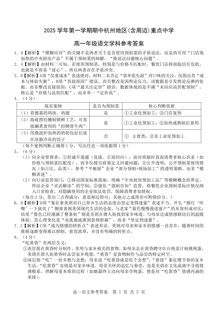 高一语文答案--浙江省杭州市地区(含周边)重点中学2025学年第一学期高一年级期中考试