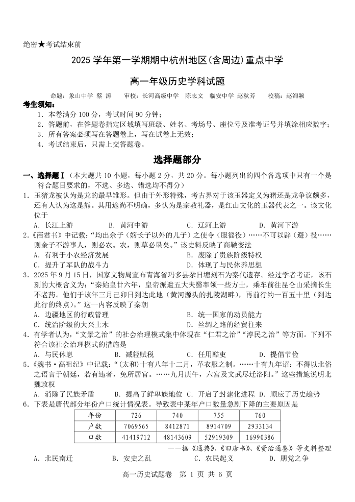 高一历史--浙江省杭州市地区(含周边)重点中学2025学年第一学期高一年级期中考试