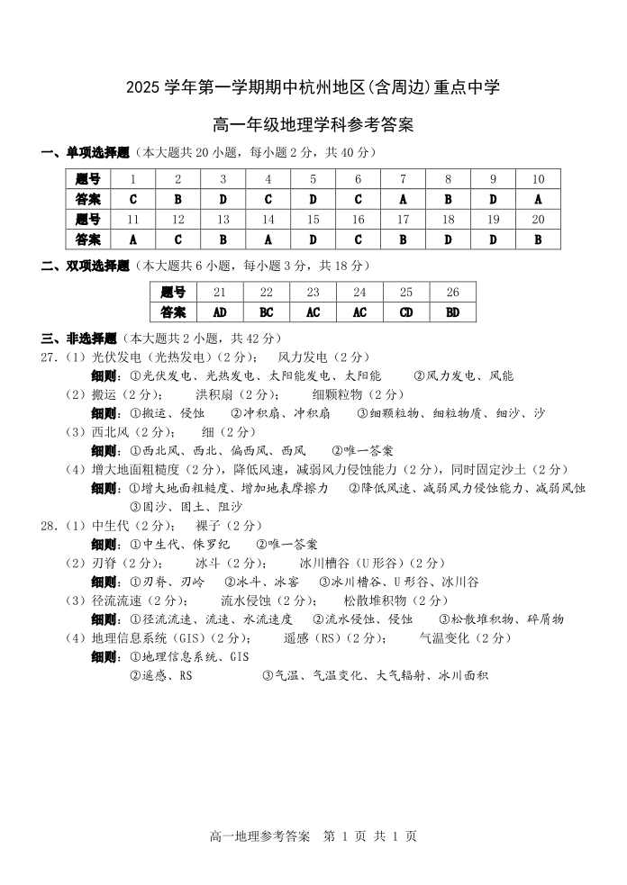 高一地理答案--浙江省杭州市地区(含周边)重点中学2025学年第一学期高一年级期中考试