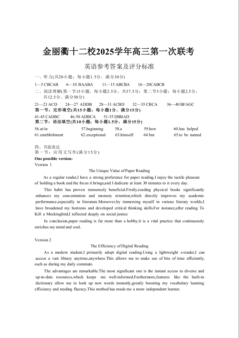 高三英语答案--浙江省金丽衢十二校2025学年高三第一次联考