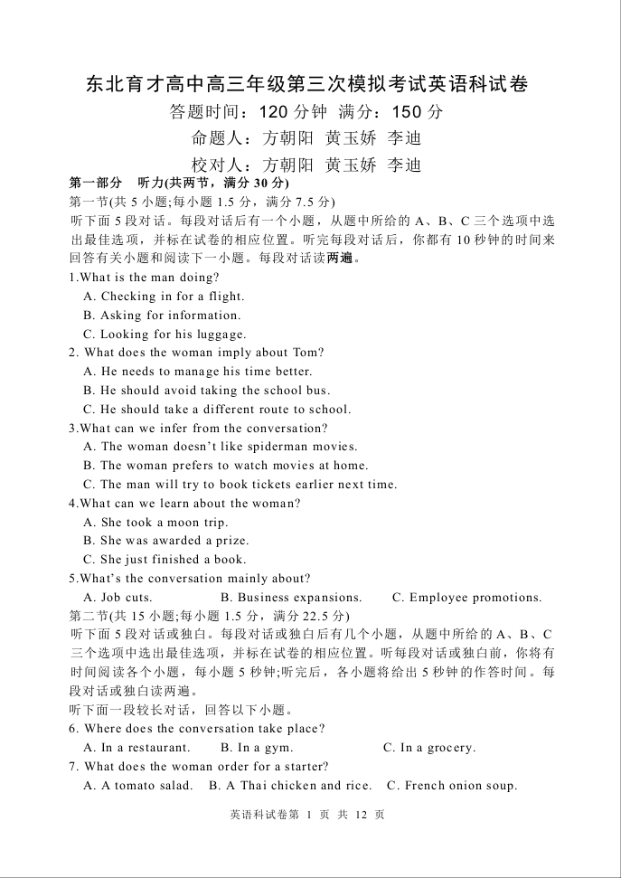 高三英语--辽宁省沈阳市东北育才学校2026届高三上学期第三次模拟考试