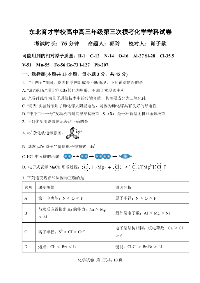 高三化学--辽宁省沈阳市东北育才学校2026届高三上学期第三次模拟考试
