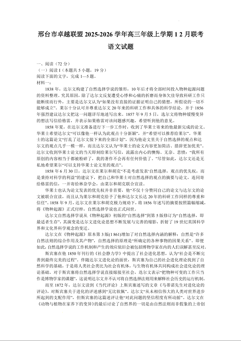 高三语文--河北省邢台市卓越联盟2026届高三上学期12月期中考试