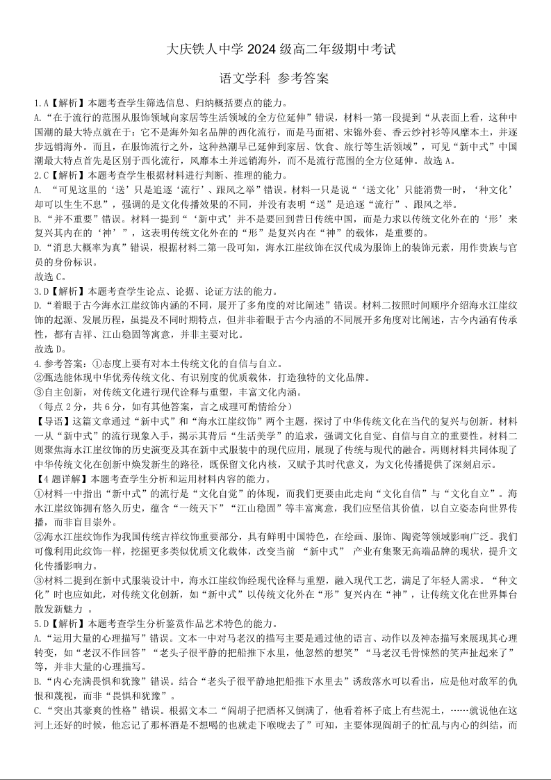 高二语文答案--黑龙江省大庆铁人中学2025-2026学年高二上学期期中考试